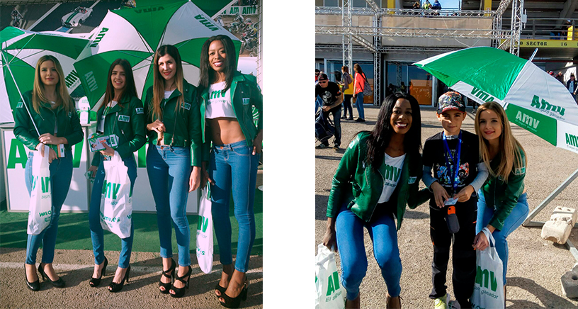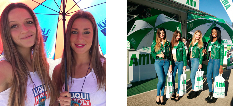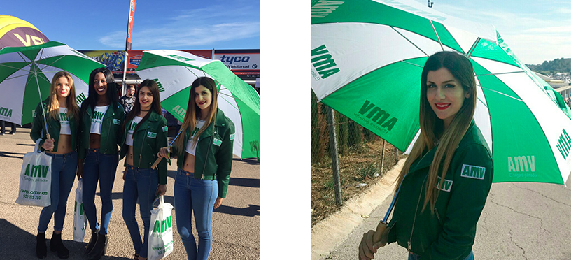 A nuestras azafatas se las podía reconocer por unos coloridos paraguas azules y rojos, y otros blancos y verdes. Además a cualquier persona que se acercara a los stands o a la zona de paddock, nuestras chicas te obsequiaban con un regalo de parte de nuestro cliente.
